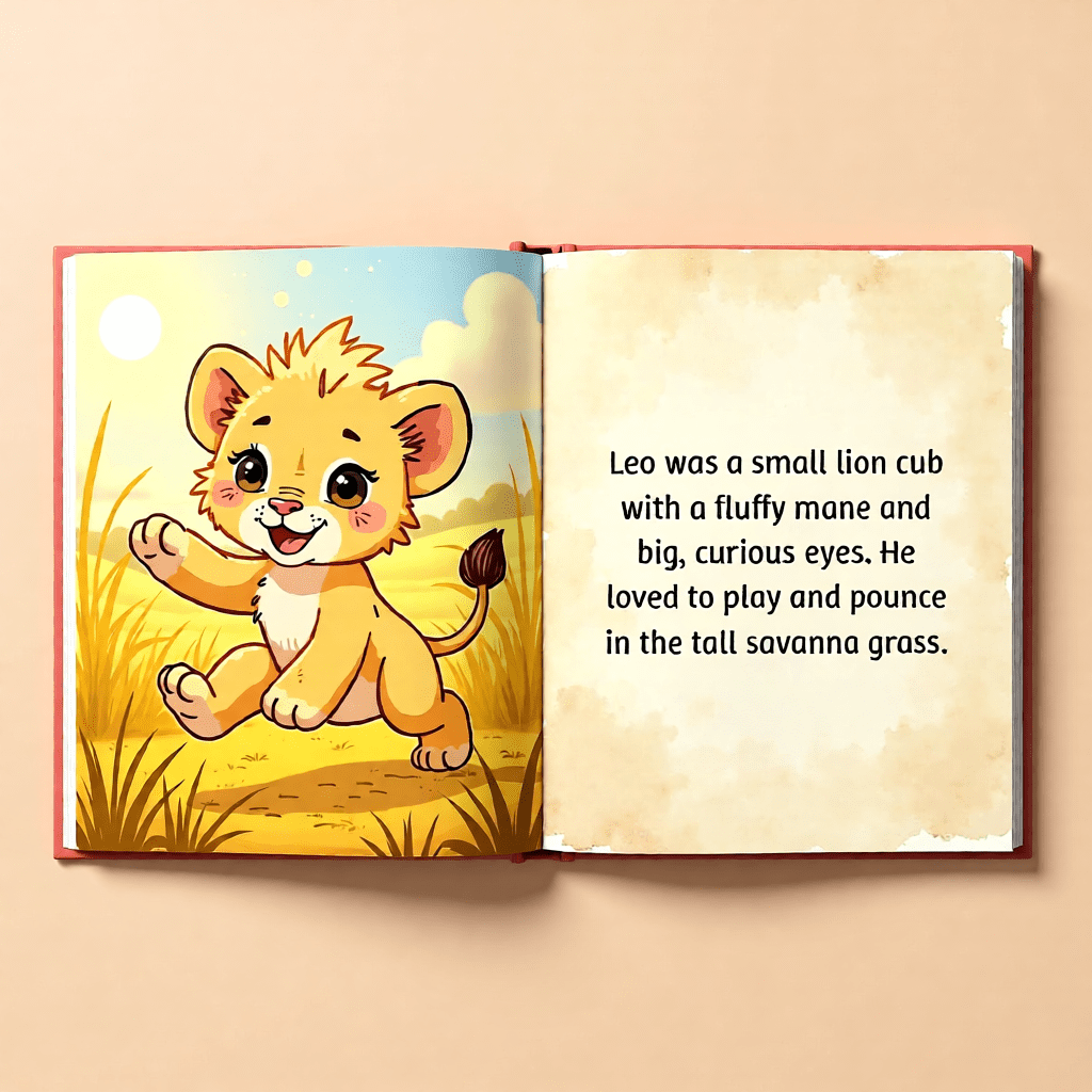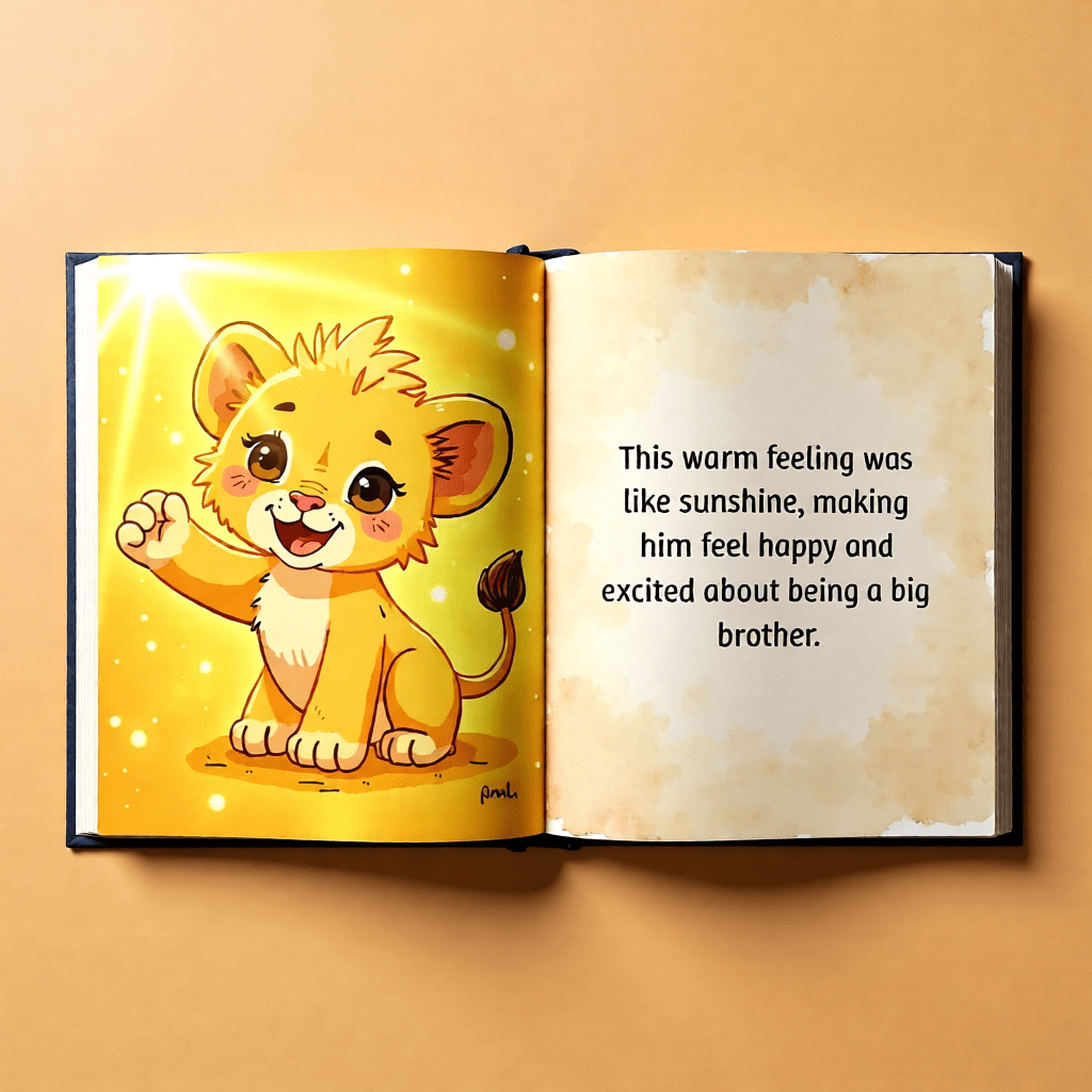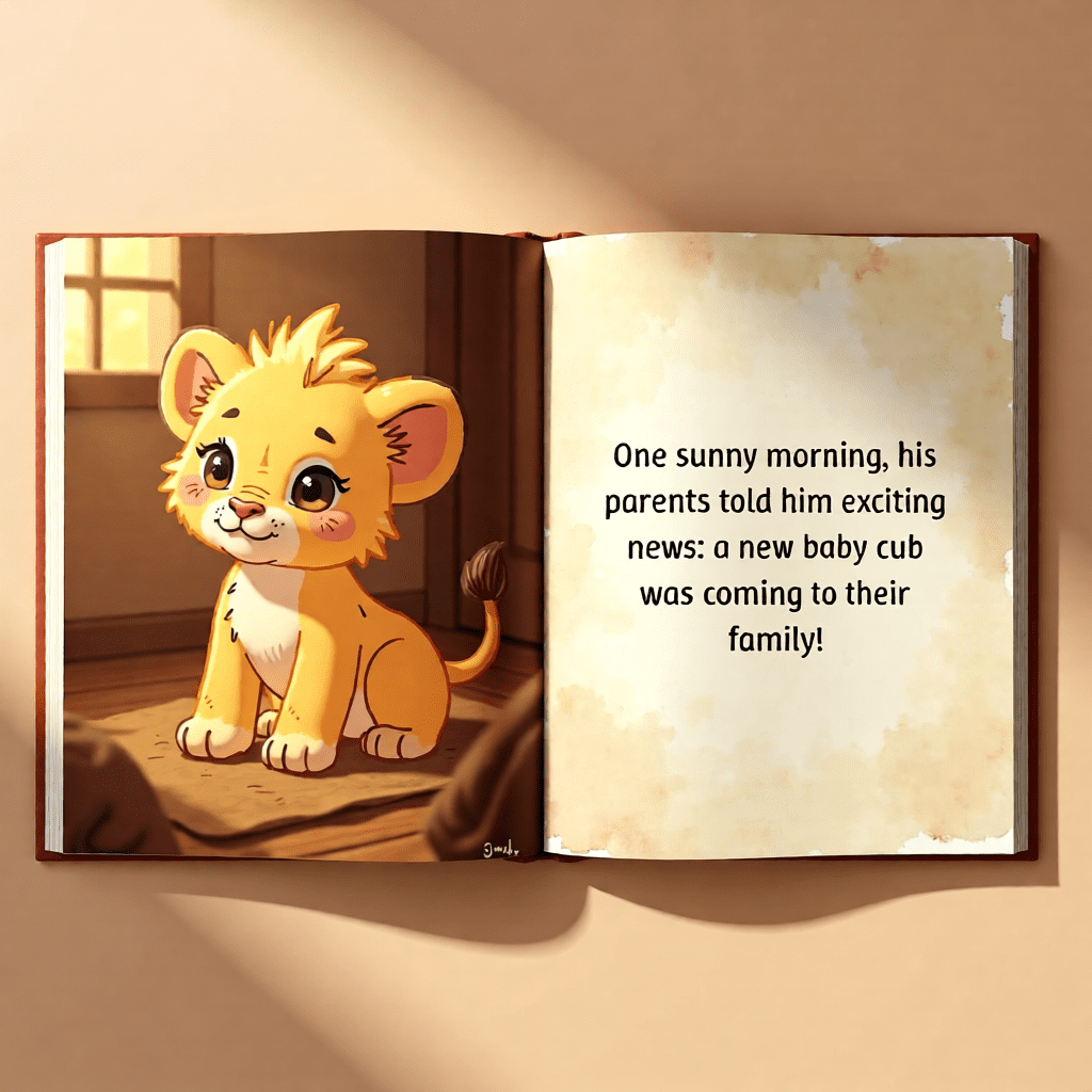 The Leo and the New Baby Feelings Story begins with Leo happily playing in the bright savanna sunshine (pg. 2). One morning, his parents share exciting news — a new baby cub is coming to the family (pg. 5).
