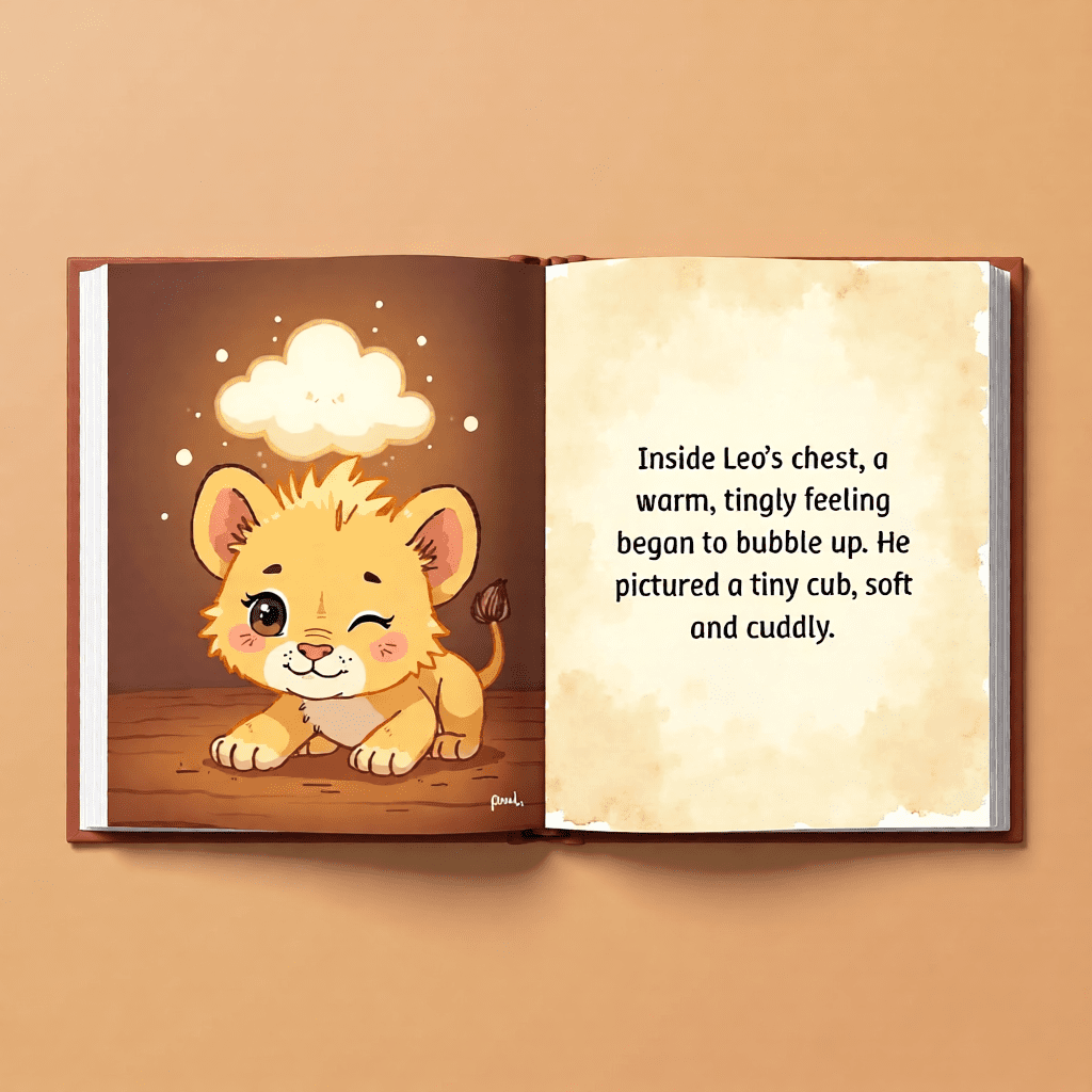 Inside Leo’s chest, a warm, tingly feeling begins to bubble up (pg. 7). He imagines a tiny cub, soft and cuddly. Sunshine glows all around him, filling him with joy (pg. 8–9).