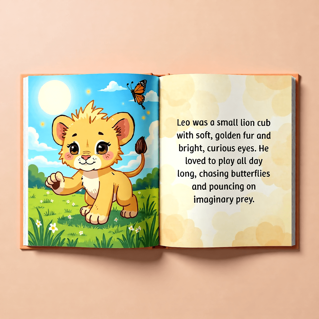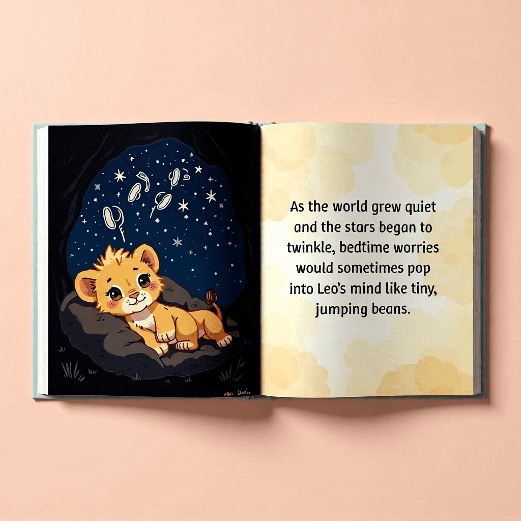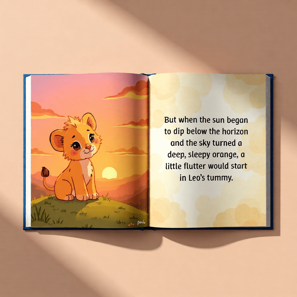 In the Leo and the Night-Time Worries Story, Leo begins his day joyful and full of play (pg. 2–3) :contentReference[oaicite:6]{index=6}, chasing butterflies and exploring the sunny world around him. But when evening arrives and the sky turns deep orange (pg. 4–5) :contentReference[oaicite:7]{index=7}, a fluttery feeling starts in his tummy — bedtime worries beginning to bubble up.