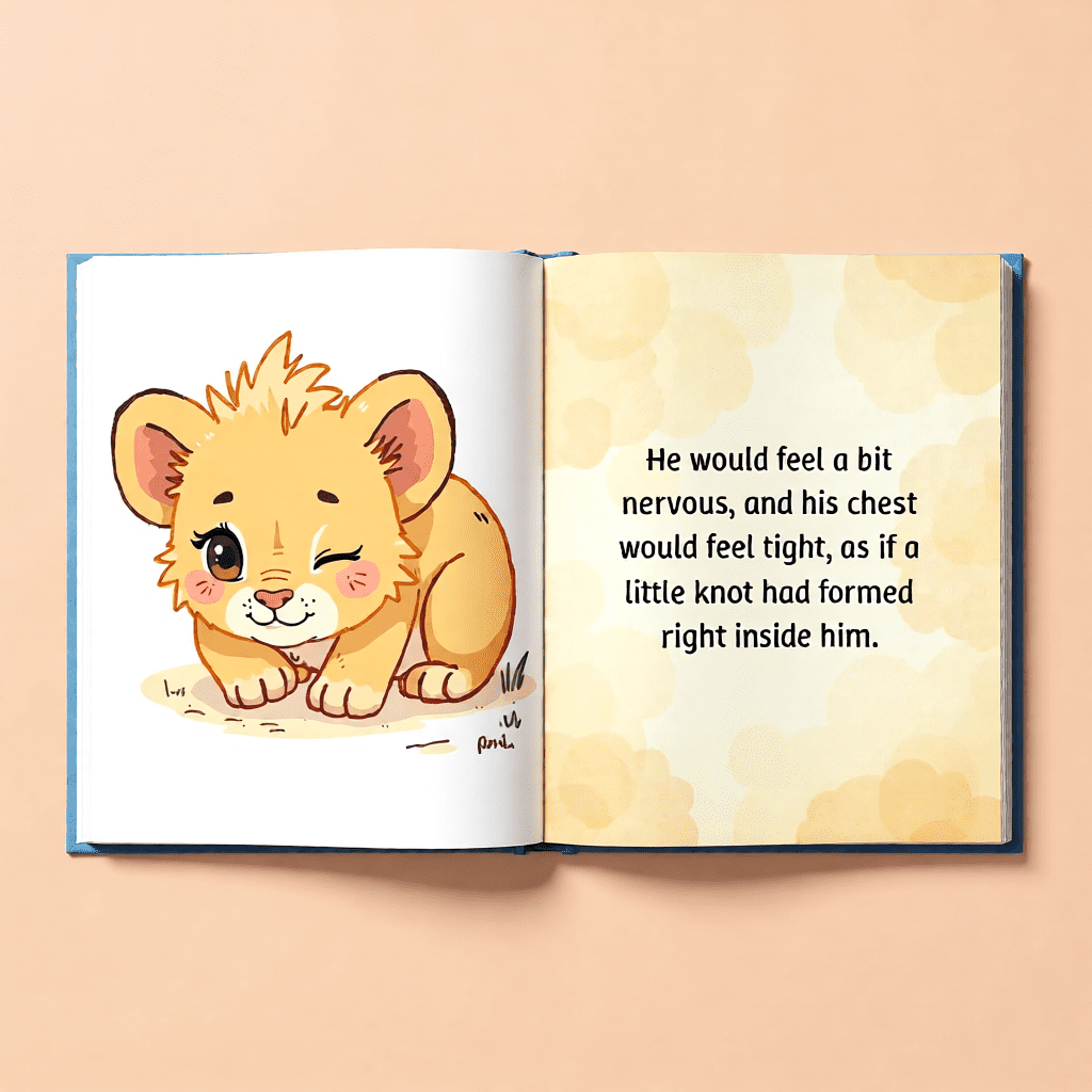 As night falls and stars glitter overhead, Leo lies awake in his cozy den (pg. 6) :contentReference[oaicite:8]{index=8}. Thoughts pop into his mind like little jumping beans (pg. 7) :contentReference[oaicite:9]{index=9}. His chest tightens into a small knot (pg. 9) :contentReference[oaicite:10]{index=10}, and his tummy wiggles nervously (pg. 11) :contentReference[oaicite:11]{index=11}. These pages beautifully show how anxiety feels physically for young children.